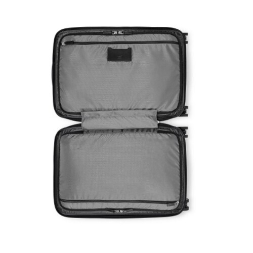 Organização do interior: Compartimento espaçoso para roupas com alças ajustáveis e fecho de correr, 2 bolsos planos médios com fecho e bolso para cartão de visita, compartimento acolchoado para computador portátil, 1 bolso grande plano com fecho;